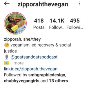Do you want to learn more about intersectionality and dive into topics discussing social justice and veganism while being enticed with delicious vegan food? You can get all of this and more with Zipporah, who currently resides in Vancouver, British Columbia. She has fun, yet educational Q&As and insightful information shared in her stories, a thriving Tiktok page, a conversation-starter Twitter and also exclusive recipes that you can find on her Patreon.
